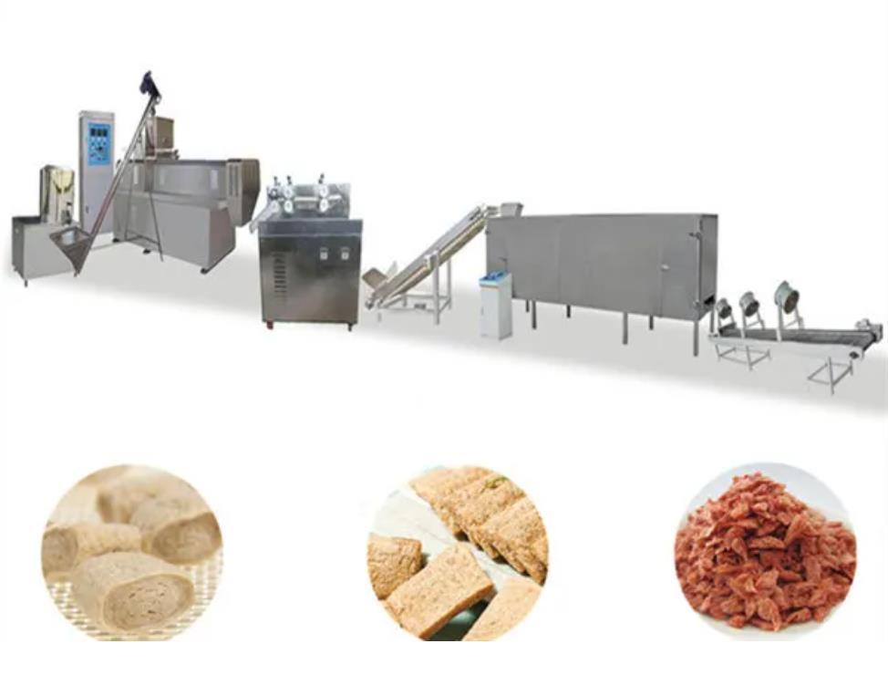 این خط طول می کشد غذا سویا و غذا بادام زمینی را به عنوان مواد خام. پس از مخلوط کردن، اکسترود کردن، برش و خشک کردن، غذا به صورت فیبر لایه فیبر تبدیل می شود. محصولات نهایی دارای پروتئین بالا هستند؛ به گوشت نگاه کنید و طعم آن را بسوزانید؛ آسان بودن جذب روغن، آب و عطر و طعم؛ بدون کلسترول و چربی حیوانات، به طوری که آن را به طور گسترده ای در صنعت محصولات گوشت، تولید مواد غذایی سریع، تولید مواد غذایی عمیق یخ زده، و انواع غذاهای گیاهی و خوراکی استفاده می شود.